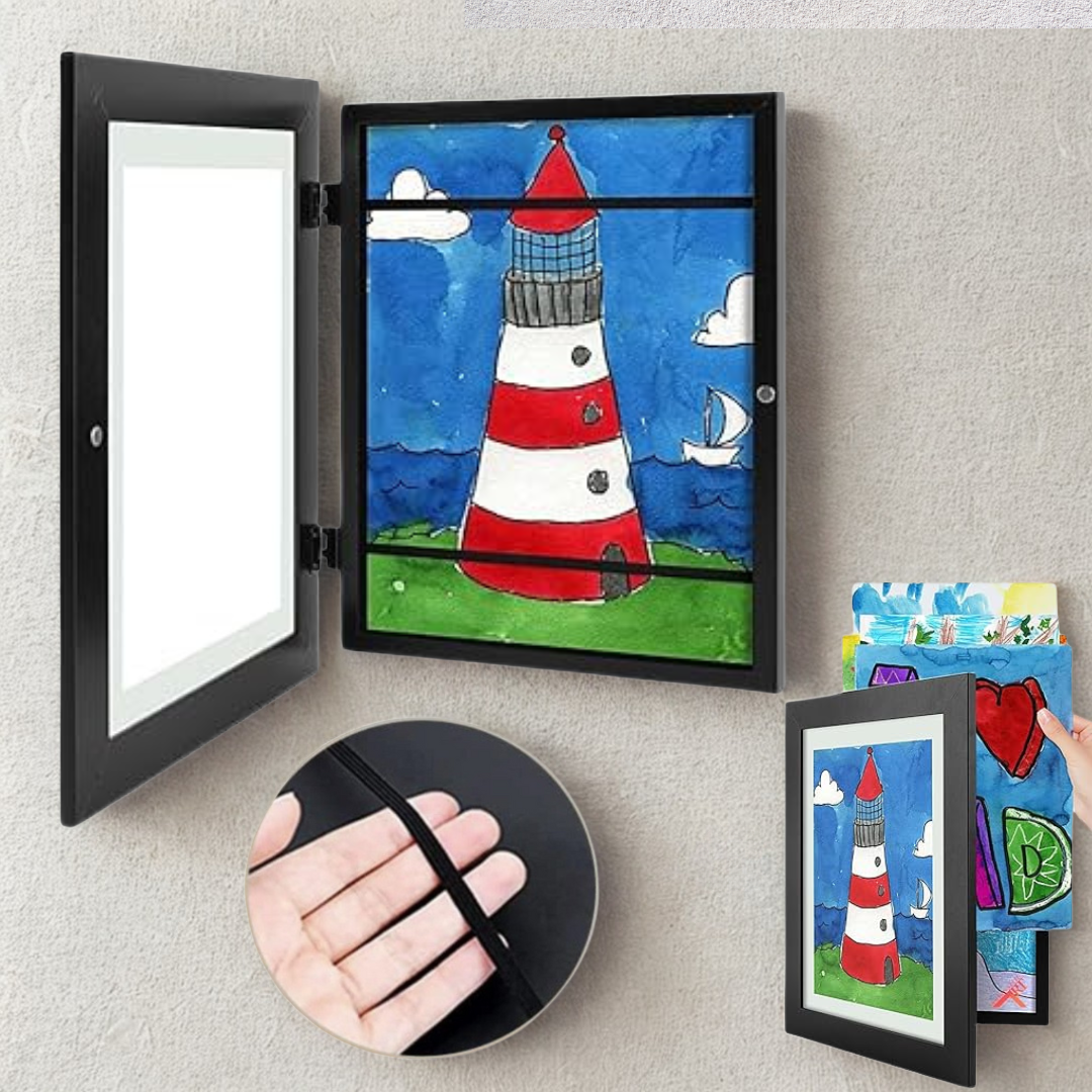 DoodleVault™ is a smart A4 display and storage frame made to keep children’s artwork organized and beautifully presented. With a spacious design and elastic holders, it can store multiple creations while featuring a favorite piece up front. This rotating gallery adds a sense of pride to any creative space, turning clutter into a source of joy.